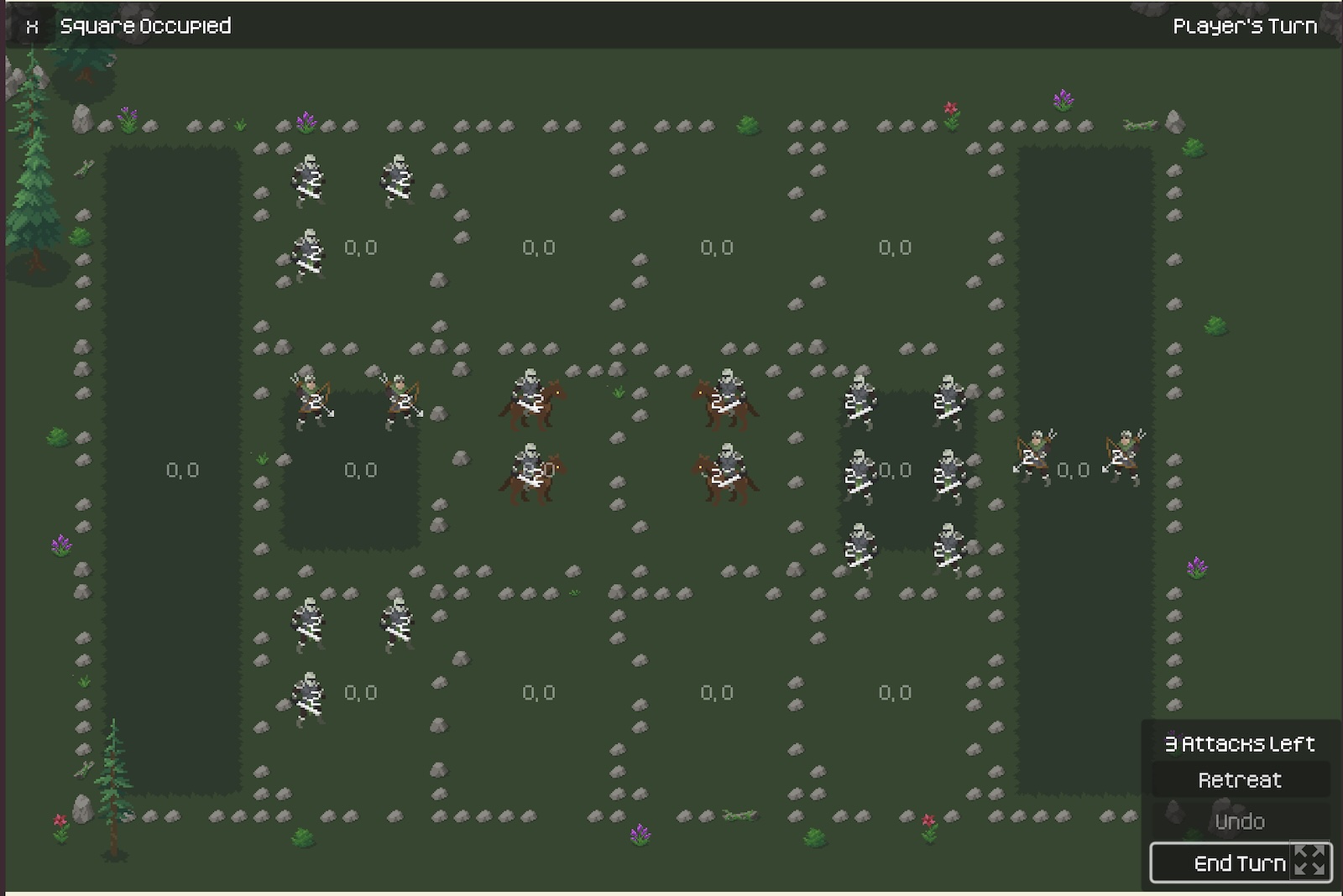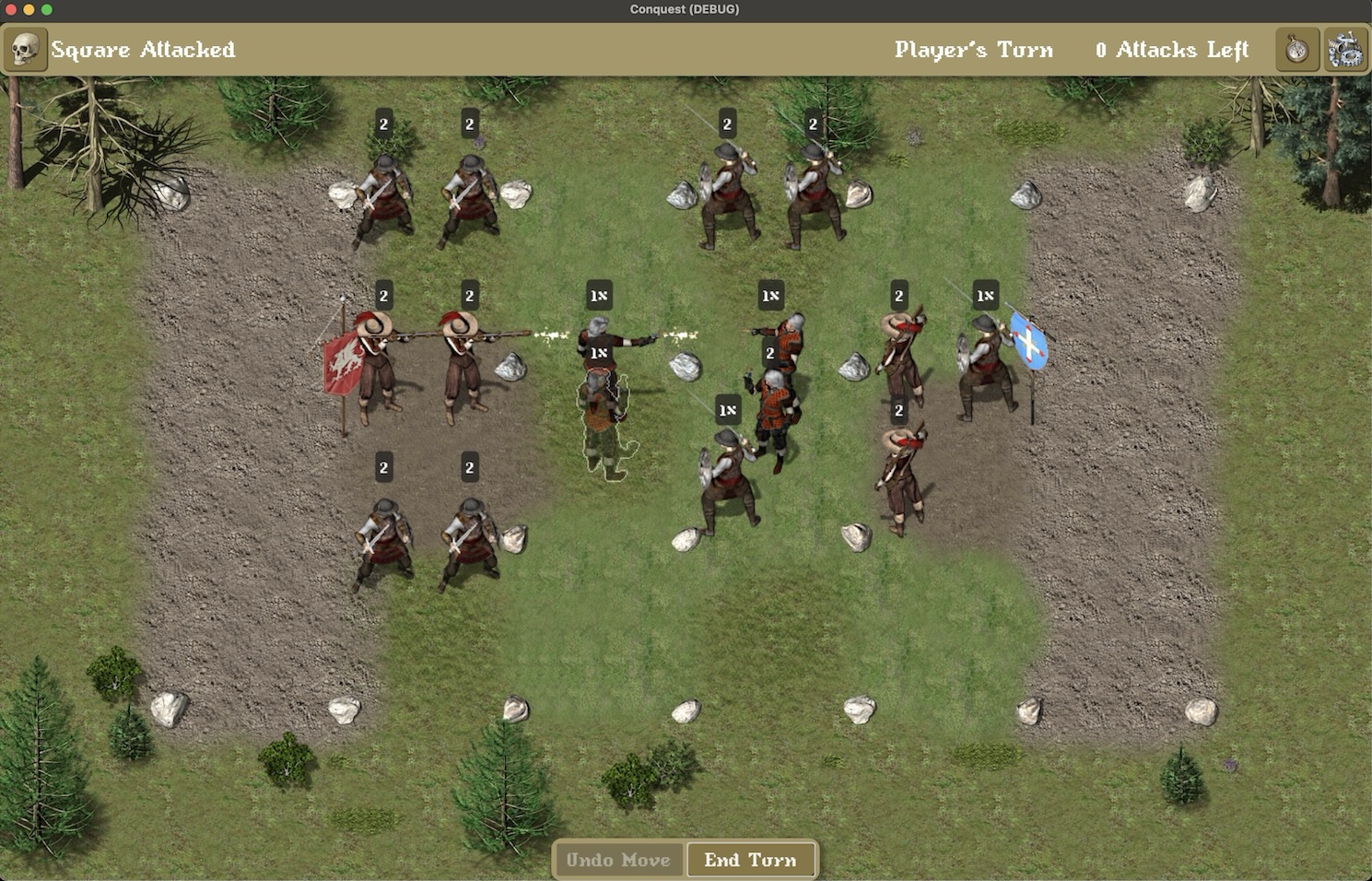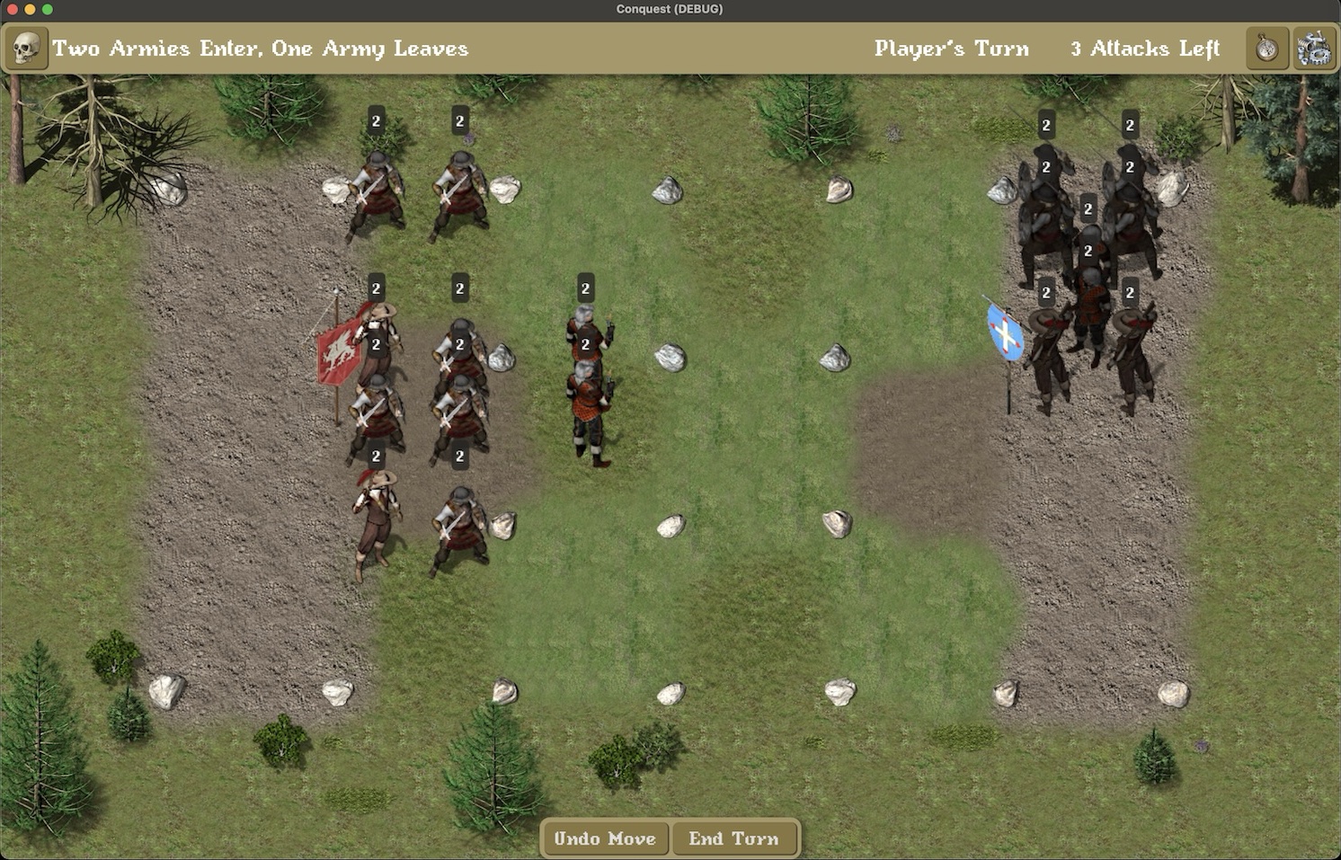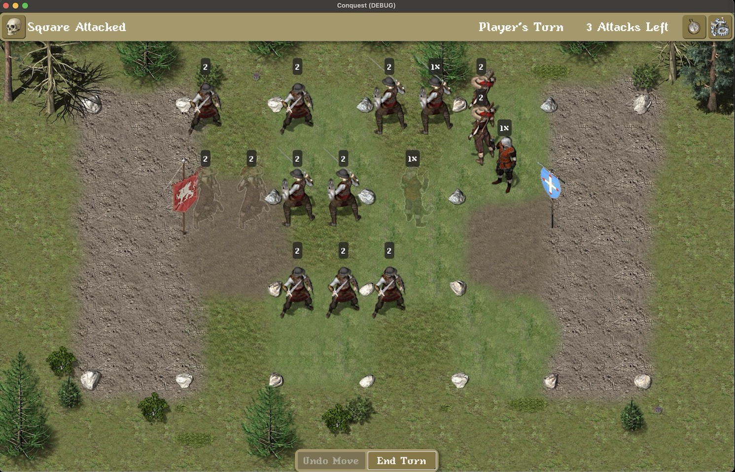 Another challenge was creating a simple computer AI for the player to play against. During the computer’s turn, each unit would pick their best movement and/or attack. Then they will be sorted by their strength, and actions would be taken until the computer ran out of moves. If enough units were panicked and the Leader’s charasma was low, the computer would retreat.