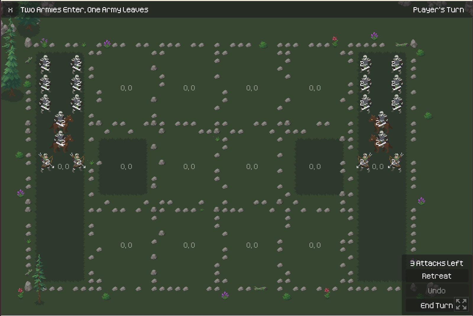 A turn-based strategy game where the player plays against a simple computer program. Each player takes turns moving their units in a limited, chess-like fashion. Attacks are made by selecting multiple units and attacking on a square of enemy units. The game ends when the player defeats the enemy army or captures their flag.