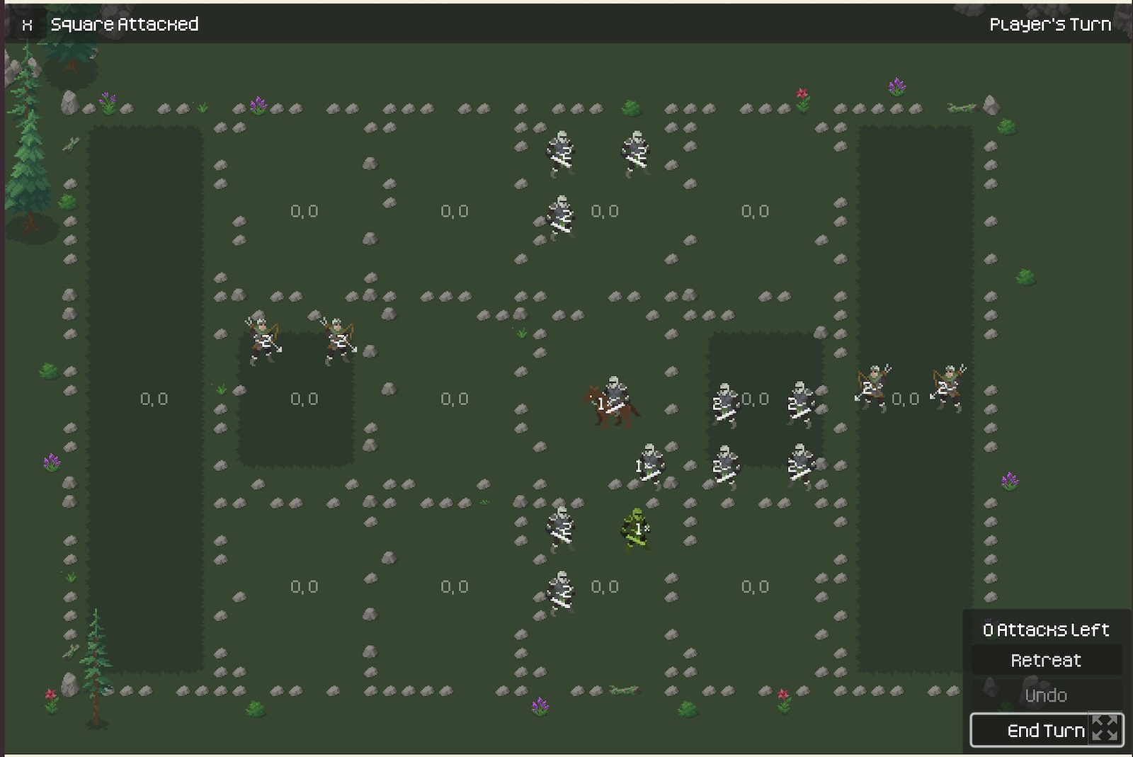 Units taking damage can chance panicking, which will cause the unit to retreat a square; if the square is fully occupied they lose an additional hit point instead. Panic chance is reduced by the Leader’s charsima stat.
