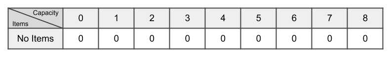 Therefore, we’ll start with a similar scenario of having 0 extra inventory space and 0 items to pick up. Yes, this sounds strange at first. Why consider such a scenario when we know the optimal solution is 0 (i.e. no items to carry and no inventory space)? Let’s make things a bit more interesting by slowly increasing one (of two possible) inputs (e.g. increasing weight capacity by 1 unit). By doing this we introduce subproblems that are easier to solve than the whole.