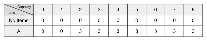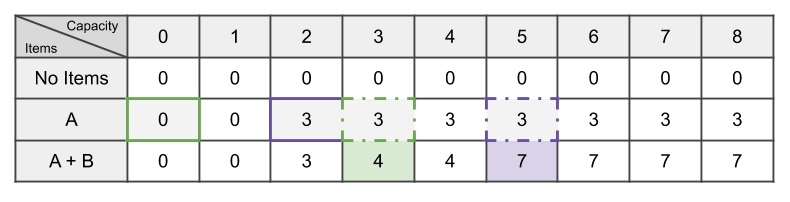 Starting at 2kg we finally have available space to take Item A (at a weight of 2kg). This continues for the rest of the row. Now things start to get interesting when we add Item B to the mix: