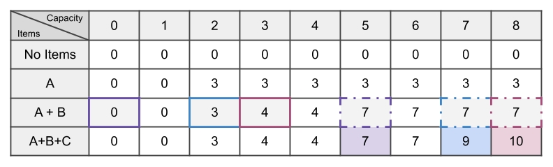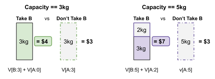 Starting with 3kg, the decision to take Item B leaves no room in the sack for Item A and thefore the total value comes to $4. Not taking Item B will leave 3kg in the sack leaving us with the previous optimal solution of $3 (directly up one row). Moving on to 5kg, we are faced with the same decision. We obviously want to take both Item A & B as they add up to 5kg.