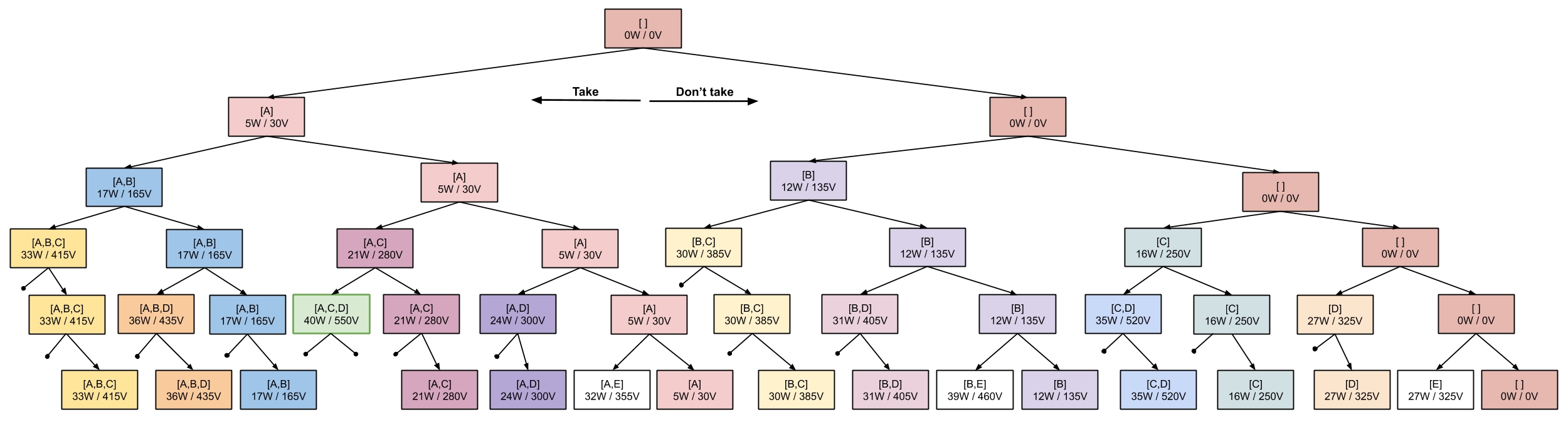 Let’s examine a visual representation of what our decision tree would look like. When we take an item we move left down the tree and right when we don’t take an item. Notice that some boxes have matching colors. These colors represents duplicate combinations, and also shows why taking a top-down approach is not so efficient (combined with the fact that you might overflow your stack if the input size is very large).