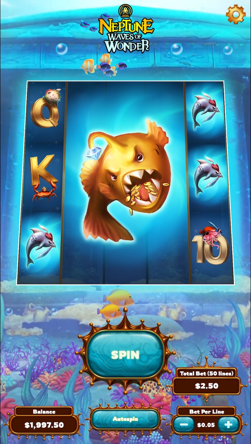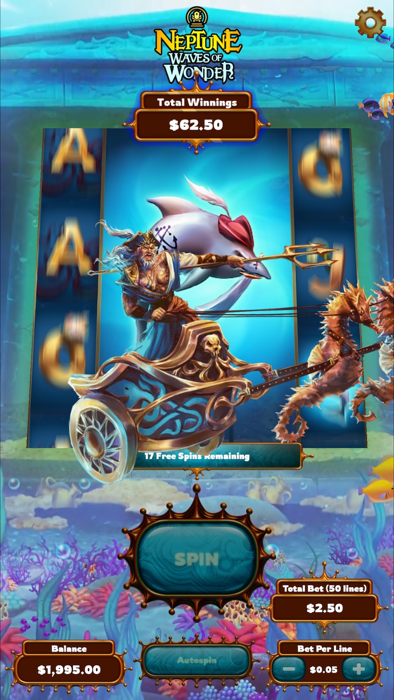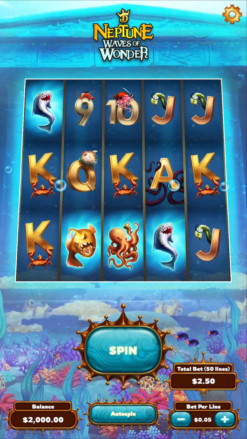 At my time with House of How, I contributed to a slot machine game developed for DraftKings called Neptune: Waves of Wonder. The game was an underwater themed slot machine game with traditional slot mechanics including big symbols and scatter symbols, which could lead to free spins.