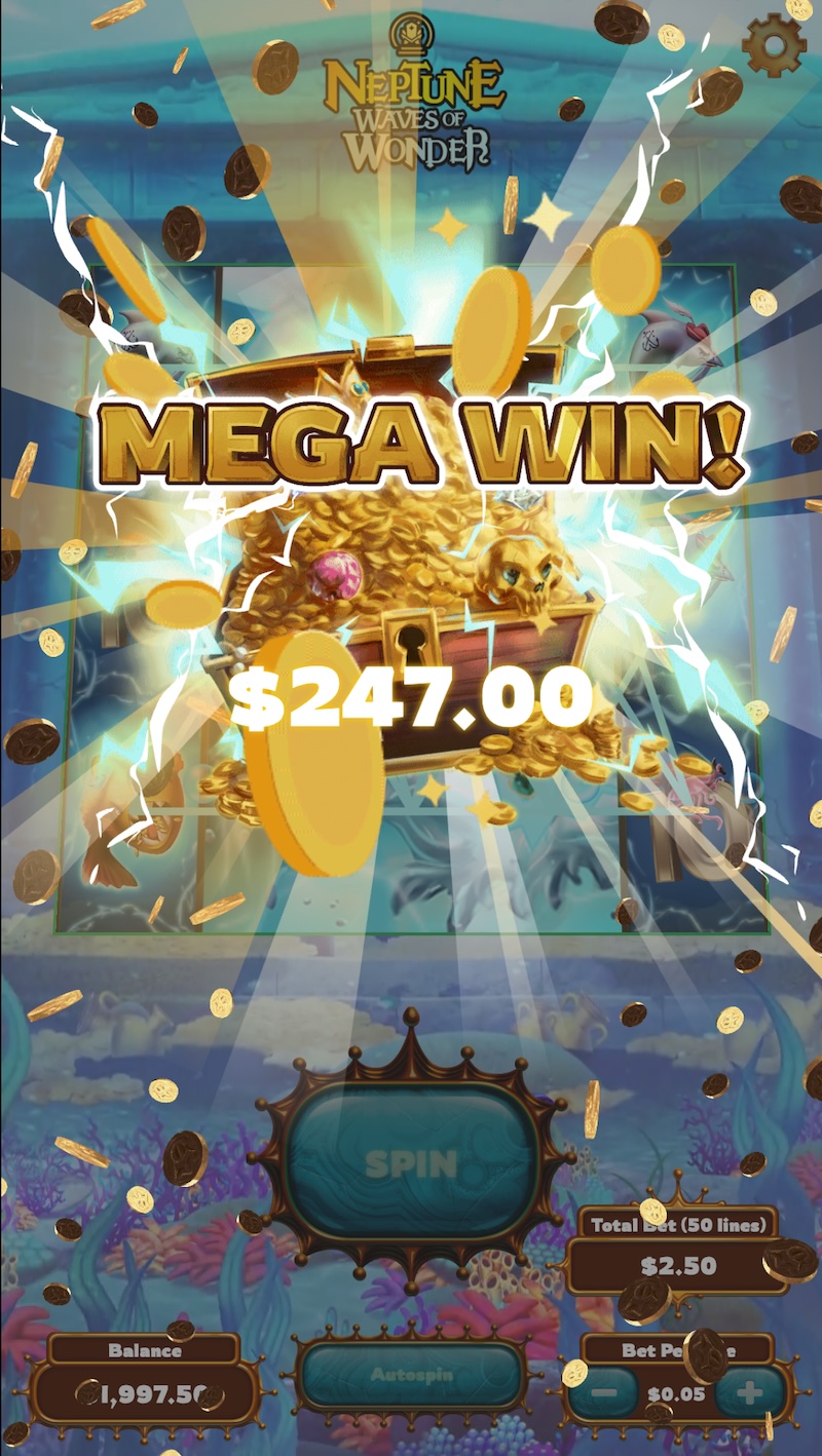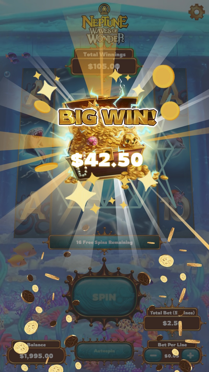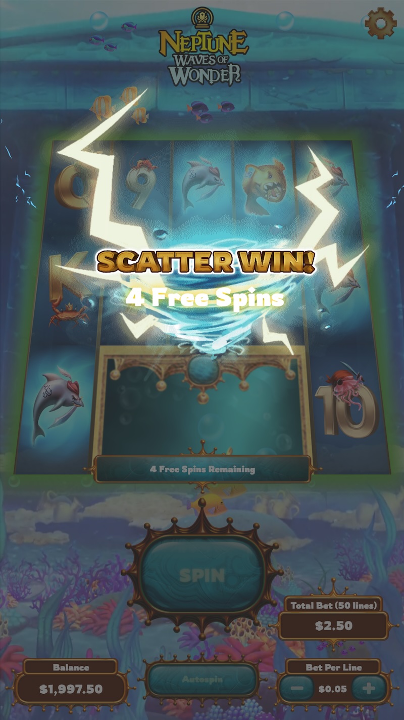 At my time with House of How, I contributed to a slot machine game developed for DraftKings called Neptune: Waves of Wonder. The game was an underwater themed slot machine game with traditional slot mechanics including big symbols and scatter symbols, which could lead to free spins.