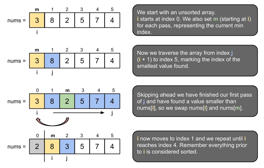 Selection Sort works in-place, meaning it doesn’t require a separate array for storing the sorted values. Instead we perform a series of swaps, finding lowest value (usually indicated by index j