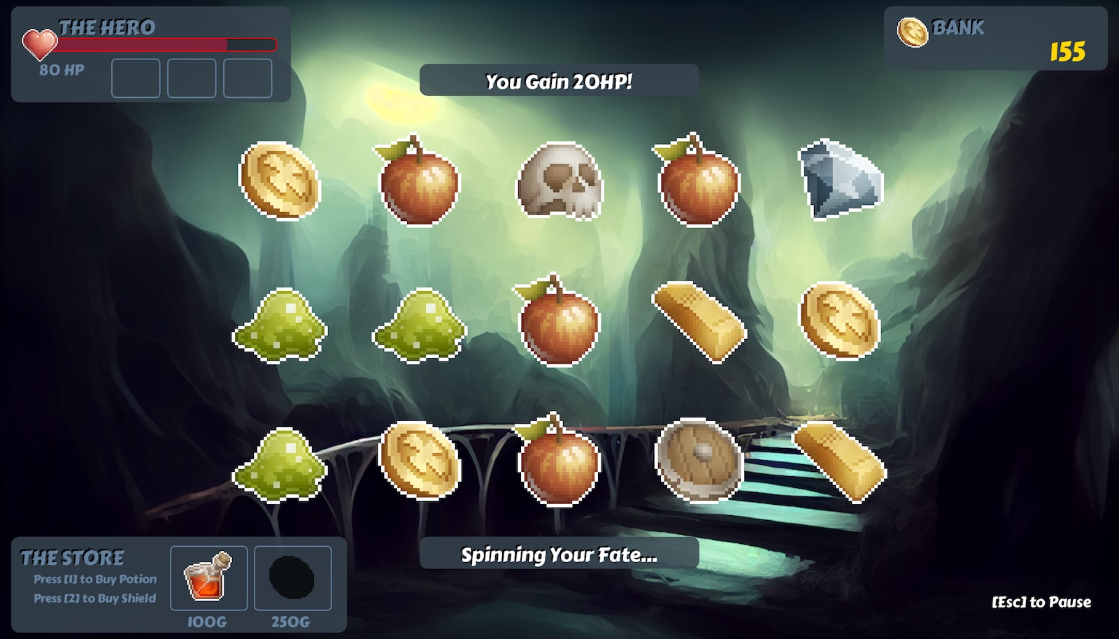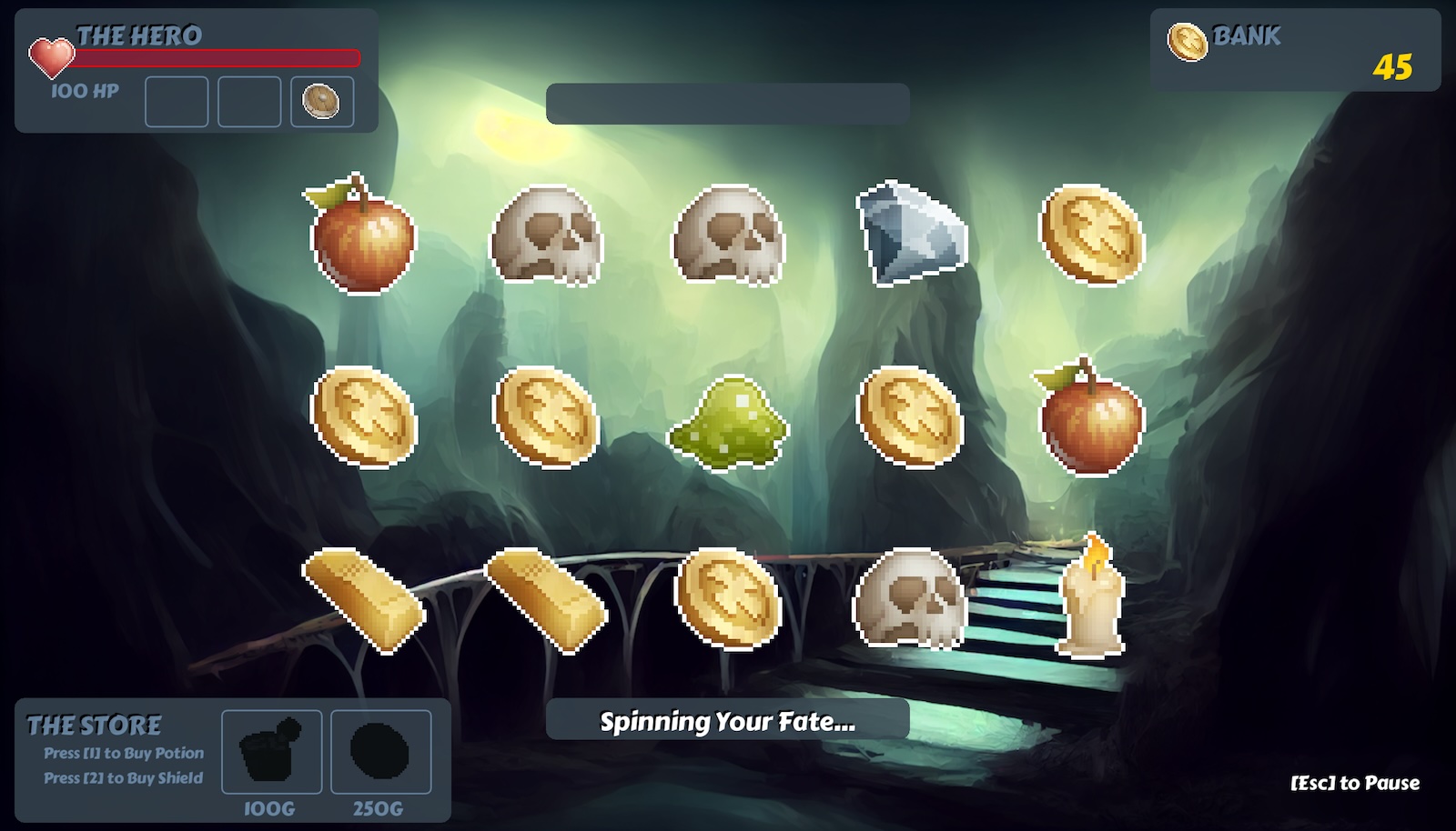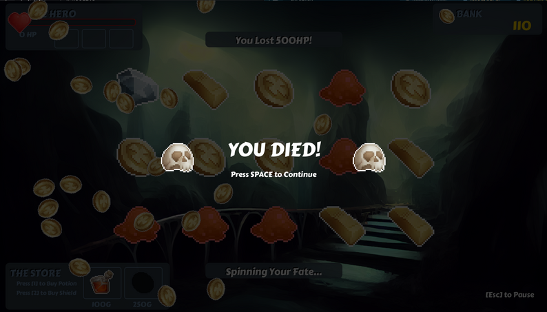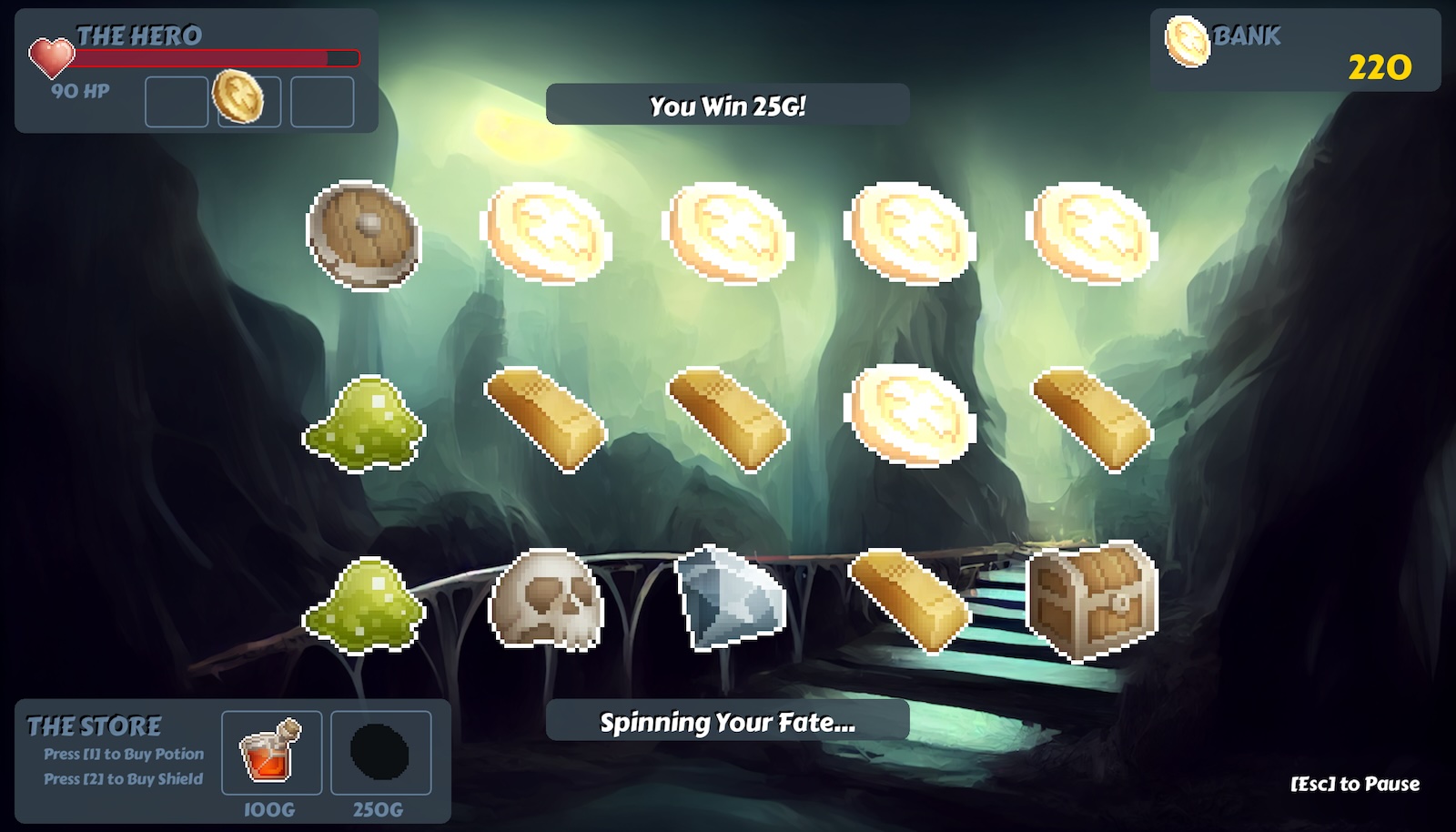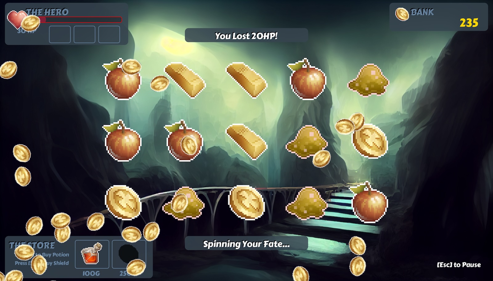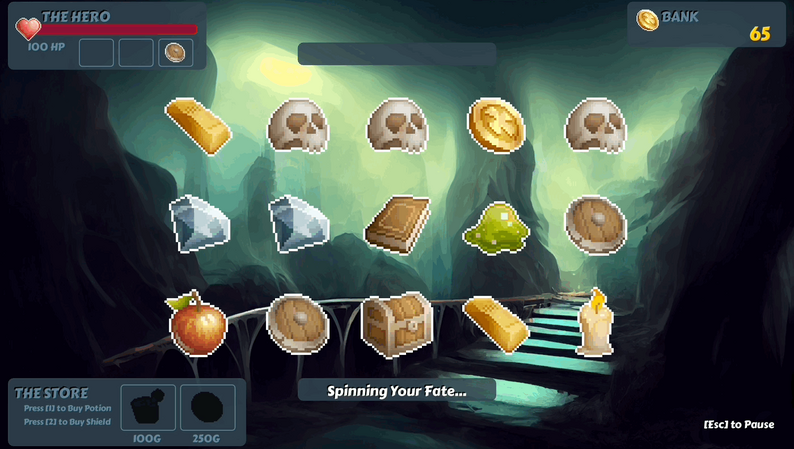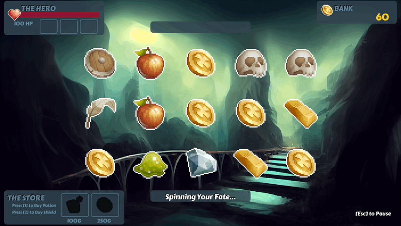 The player must continually spin the slots, collecting coins, and absorbing damage. The coins can be used to purchase health potions or a single-usage shield.